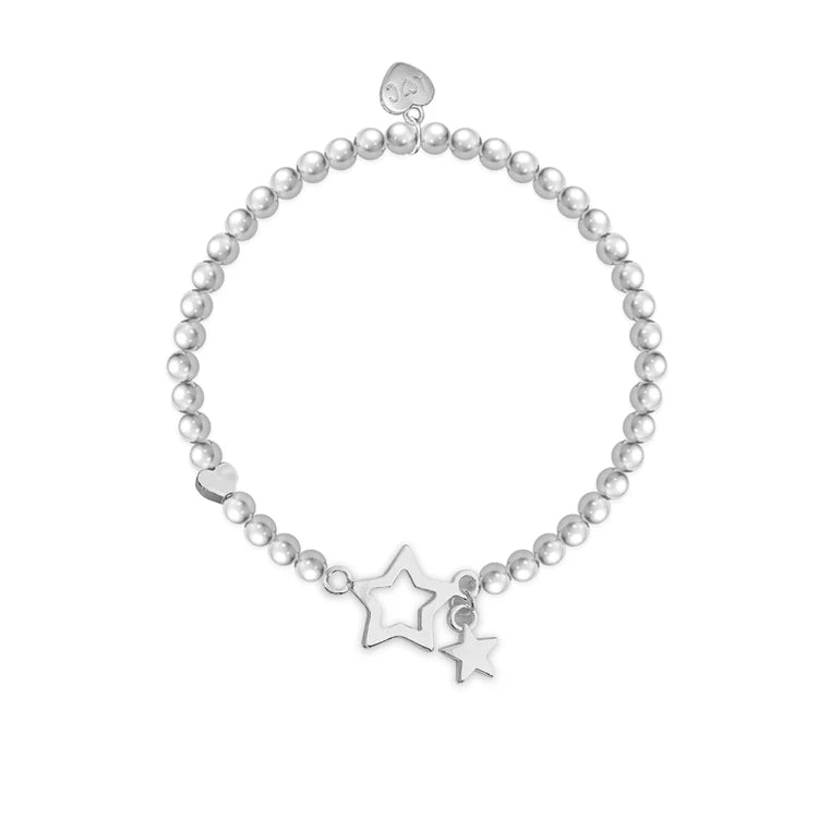 Pure silver plated open star and dangling star charms on 5mm beaded stretch bracelet. The bracelet comes presented in a luxury gift box, with a Just Because 'You Are A Superstar' reversible card.