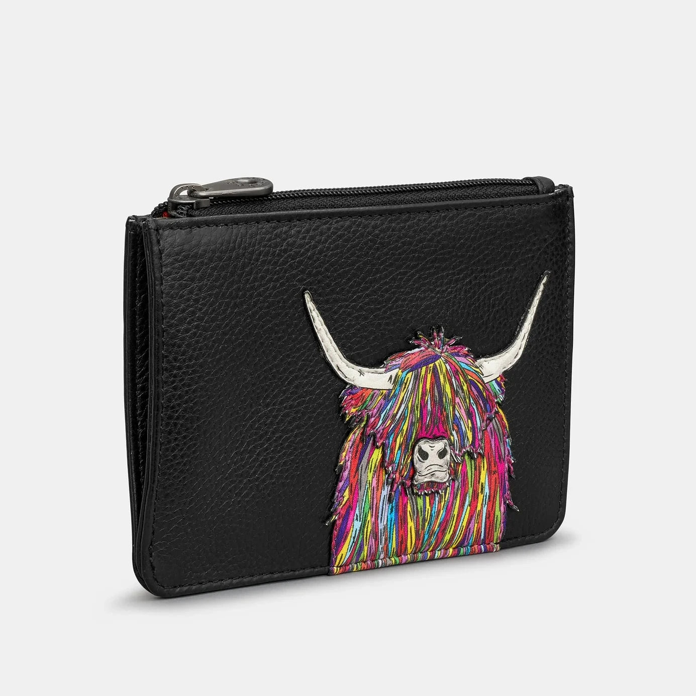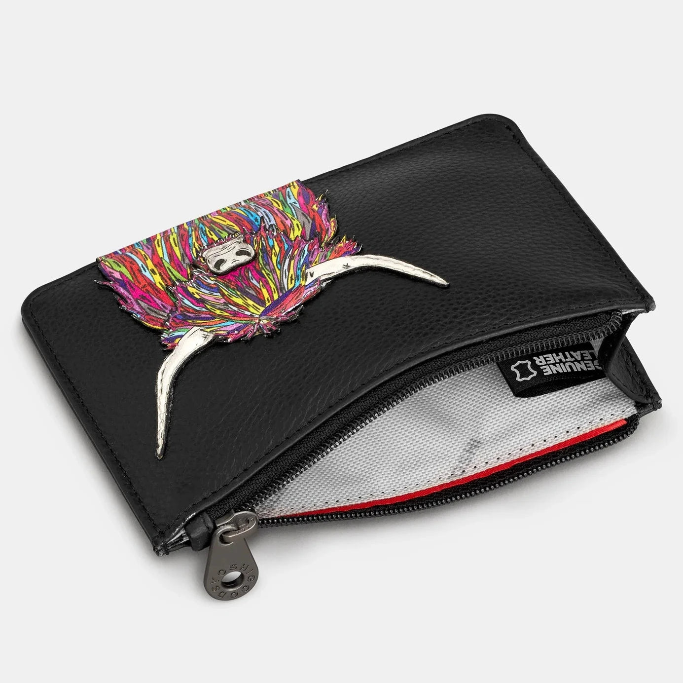 Keep it simple with this slimline leather purse for women that has been finished in a grainy black leather which contrasts against the vibrant rainbow highland cow applique on the front. This purse has a zip top fastening and a very handy credit card slot on the outer and credit cards will also fit in the zip section. RFID protection is also included as standard for your peace of mind.