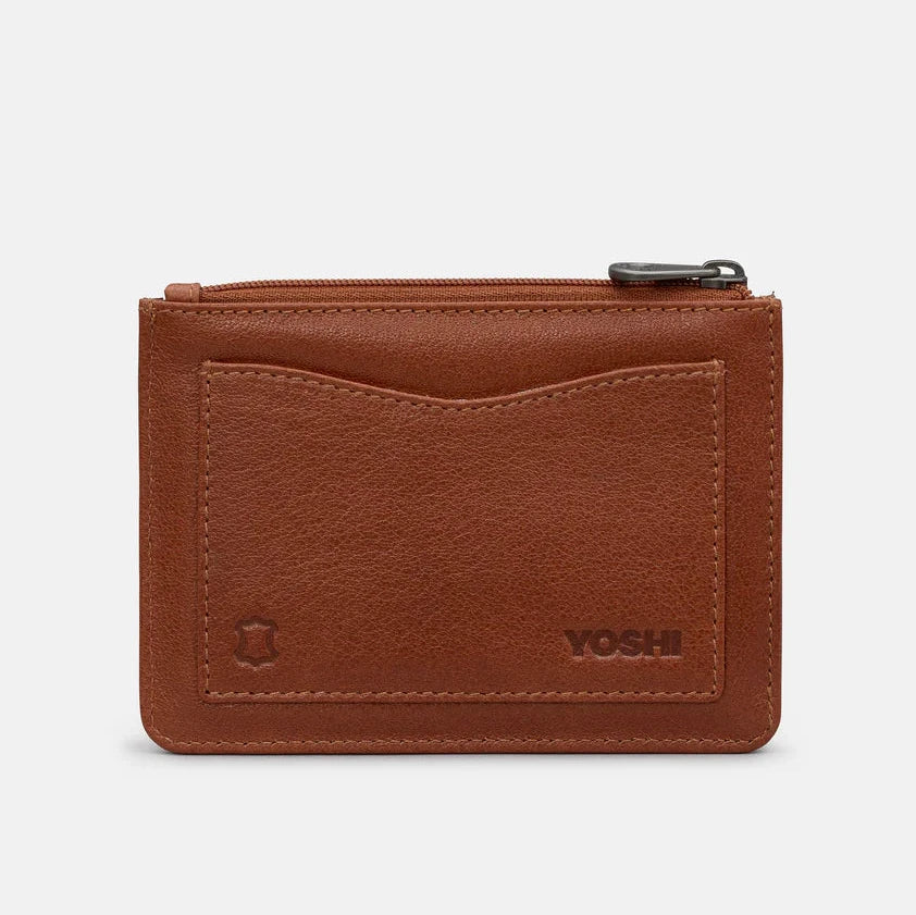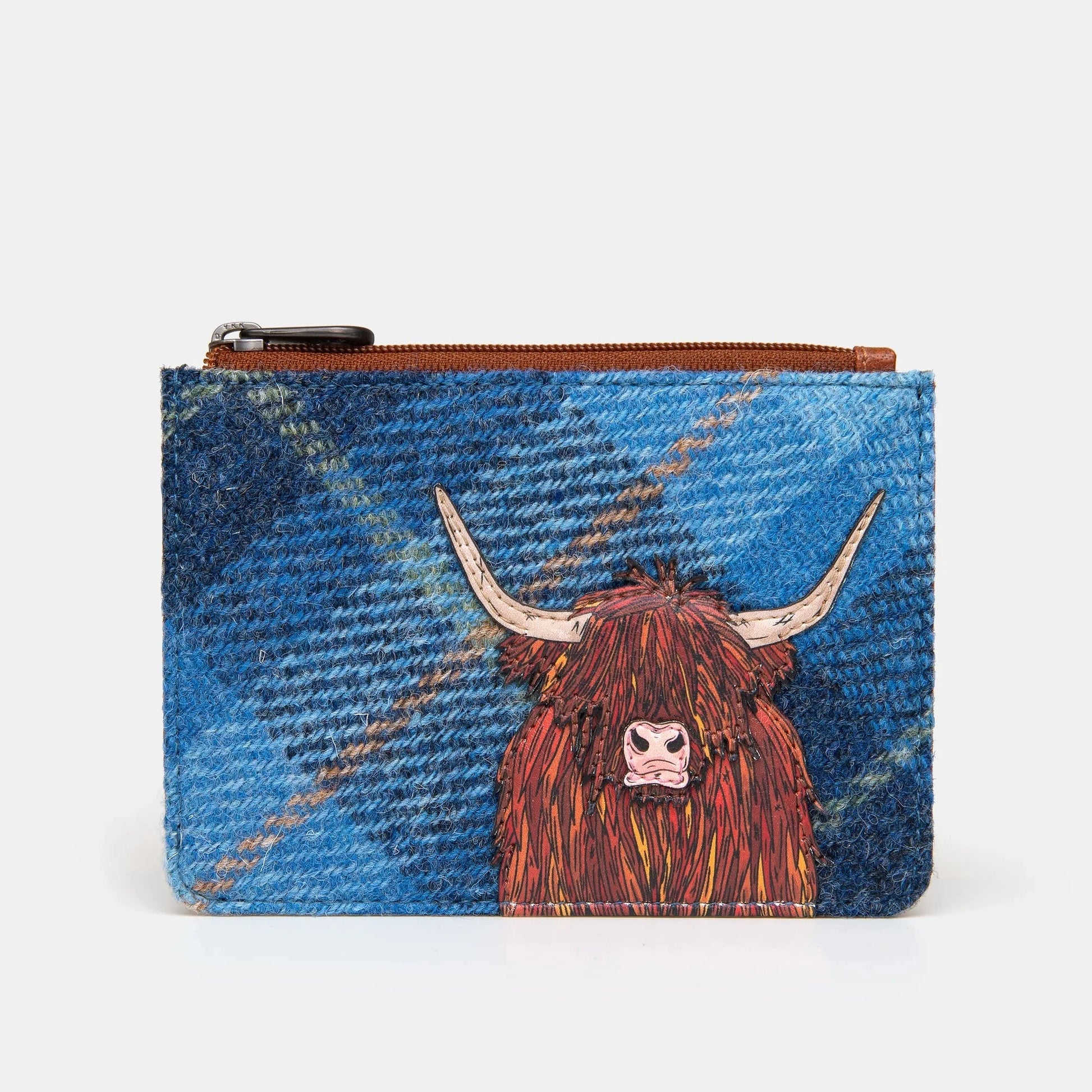 Highland Cow Brown Leather & Blue Harris Tweed Zip Top Purse