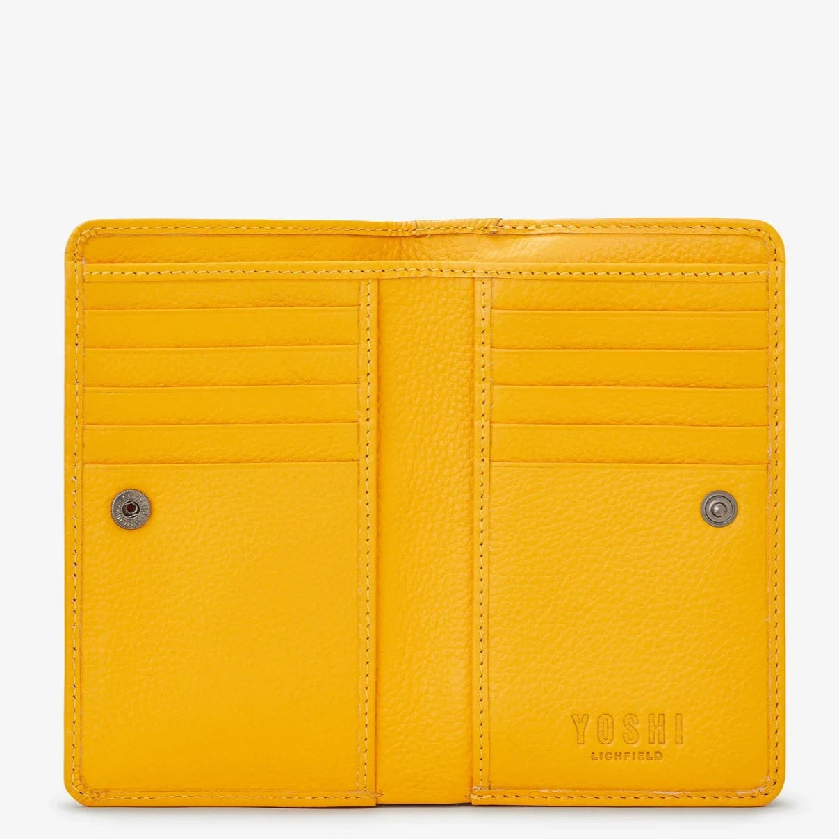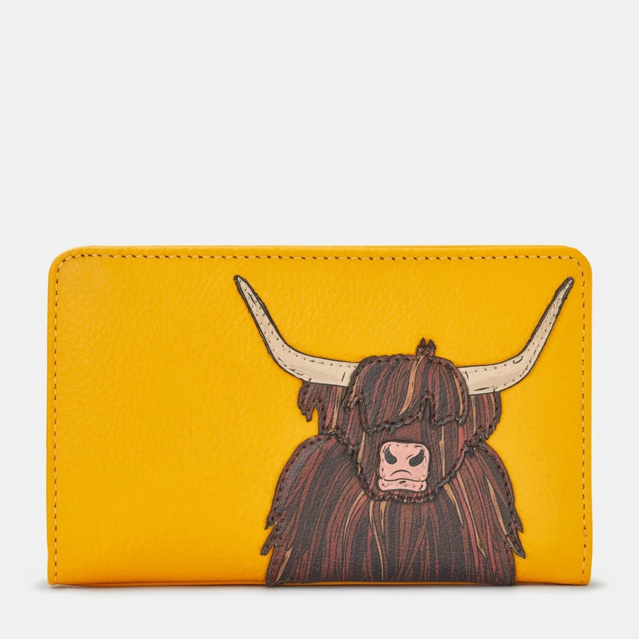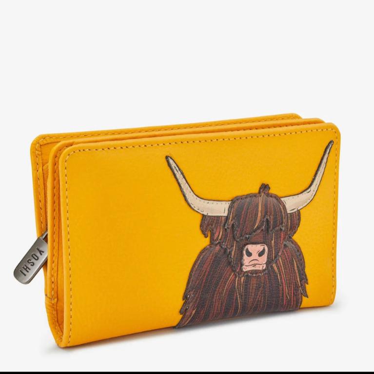 This Highland Cow flap over yellow leather purse for ladies is a lovely design with space for credit cards, coins, and notes. The applique detailing is expertly handcrafted onto the front of this style which helps bring this eye catching style to life. It also has secure RFID Blocking technology.