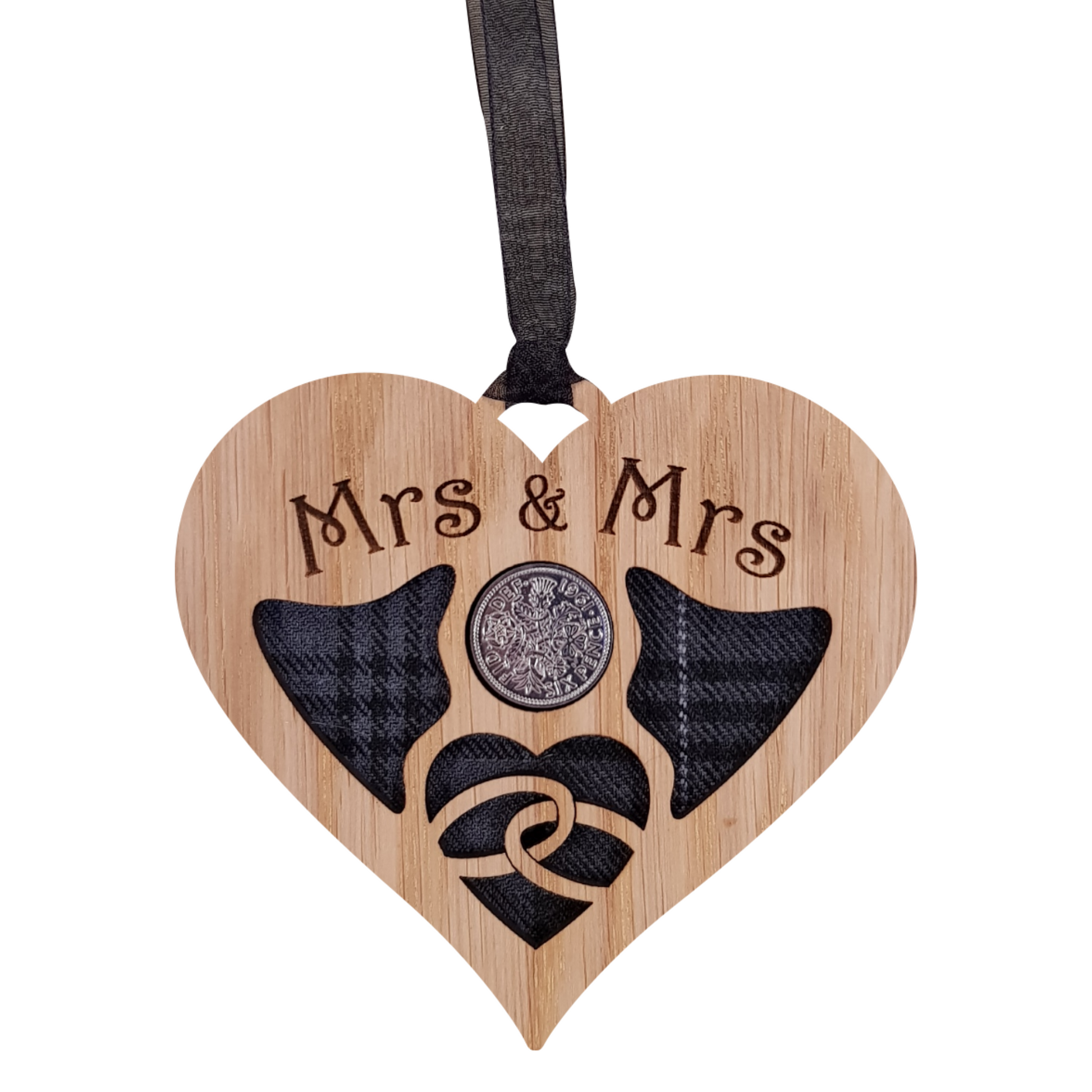 This "Mrs & Mrs" heart-shaped hanging wooden plaque with a lucky sixpence in the centre and linked rings is a beautiful wedding gift.