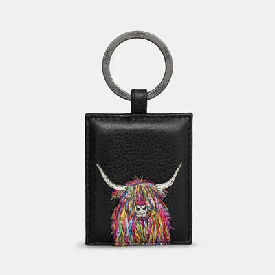 This YOSHI Highland Cow keyring features a vibrant rainbow-coloured highland cow which sits on a black leather background and is the perfect way to store and carry your keys on its secure metal ring fitting.