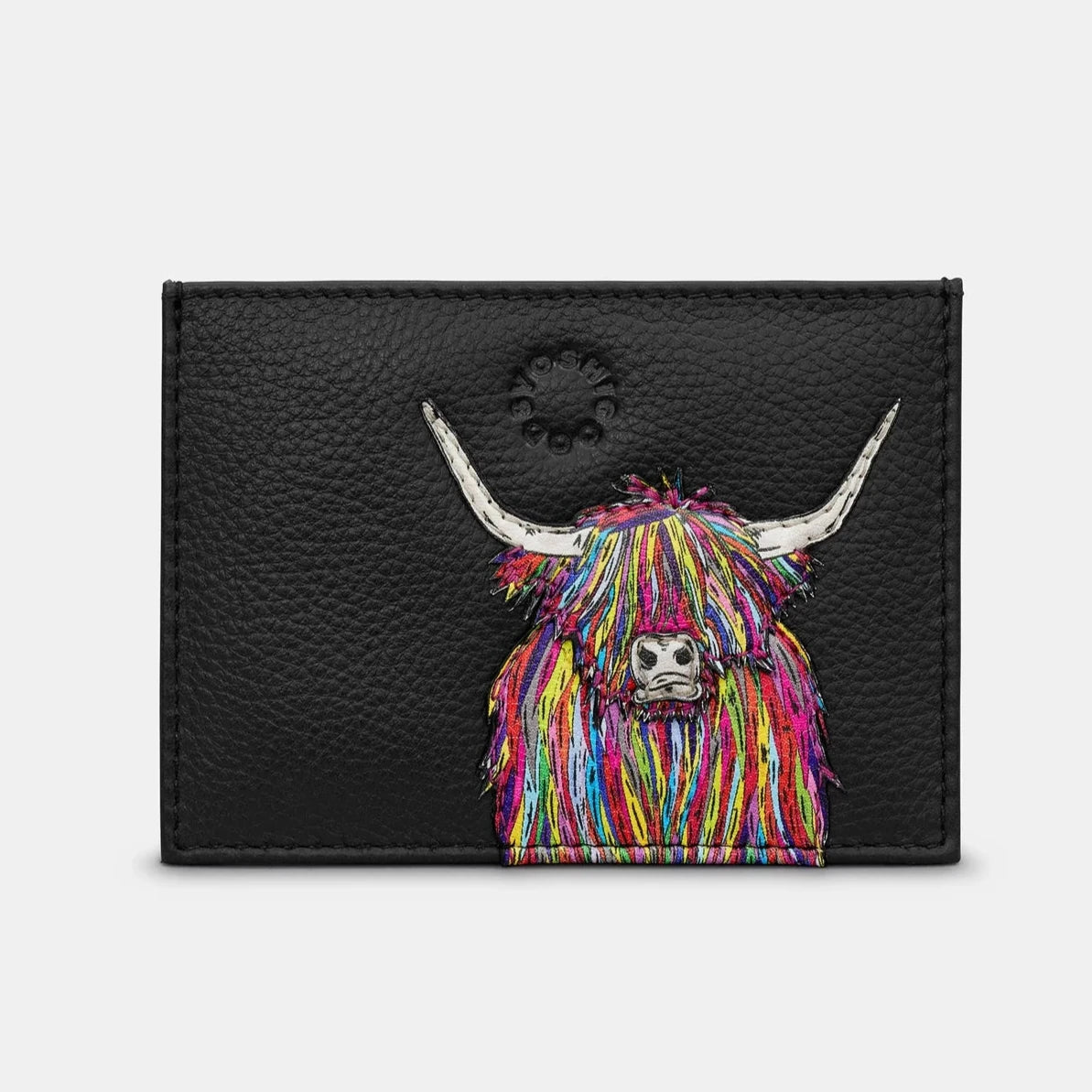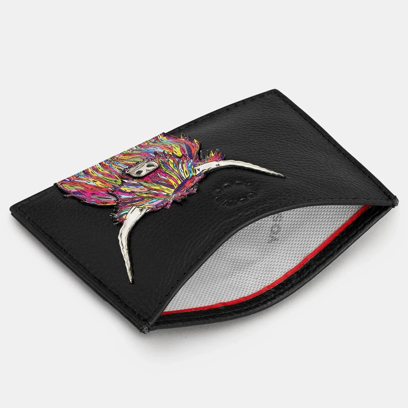 This slim leather card holder features our highland cow applique design. There's a vibrant splash of colour with the rainbow cow design on the front of this black leather credit card holder which has RFID Protection, two back card slots, and a middle slip pocket for storing extra cards and folded notes etc.