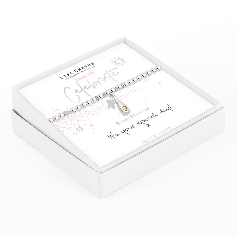 Featuring silver plated elastic bracelet with crystal rondelles between beads and hanging champagne bottle and small star charm.