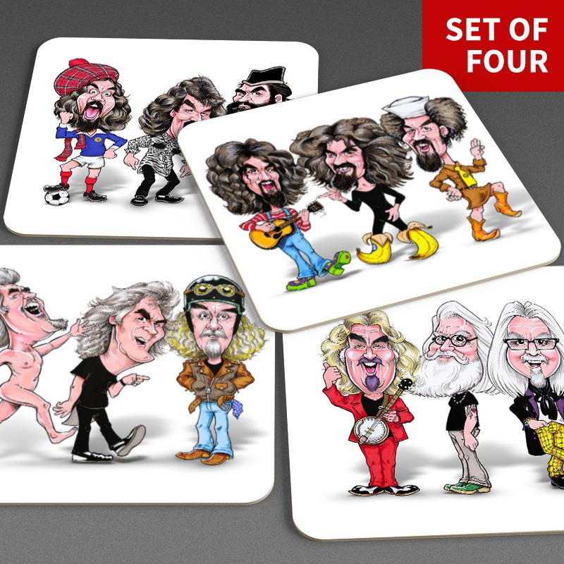 Set of 4 coasters of Bily from the 70s, 80s, 90s and 00s. Melamine finished quality coaster with cork or felt backing featuring images of Scotland's favourite comedian by Edd Travers - Scotland's leading caricaturist. Size 100mm x 100mm.