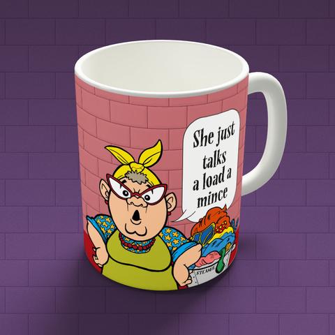 Ceramic mug featuring images of favourite characters fae the Glasgow Steamie.