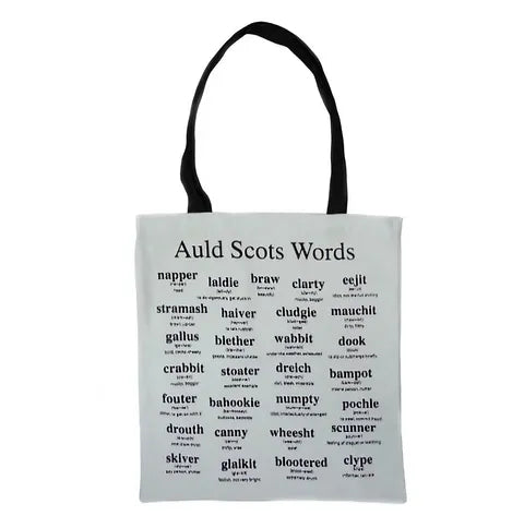 Cotton Bag with Auld Scots Words including cludgie (clud-gee) toilet, wheesht (wee-sht) be quiet and blootered (bloot-ered) extremely drunk.