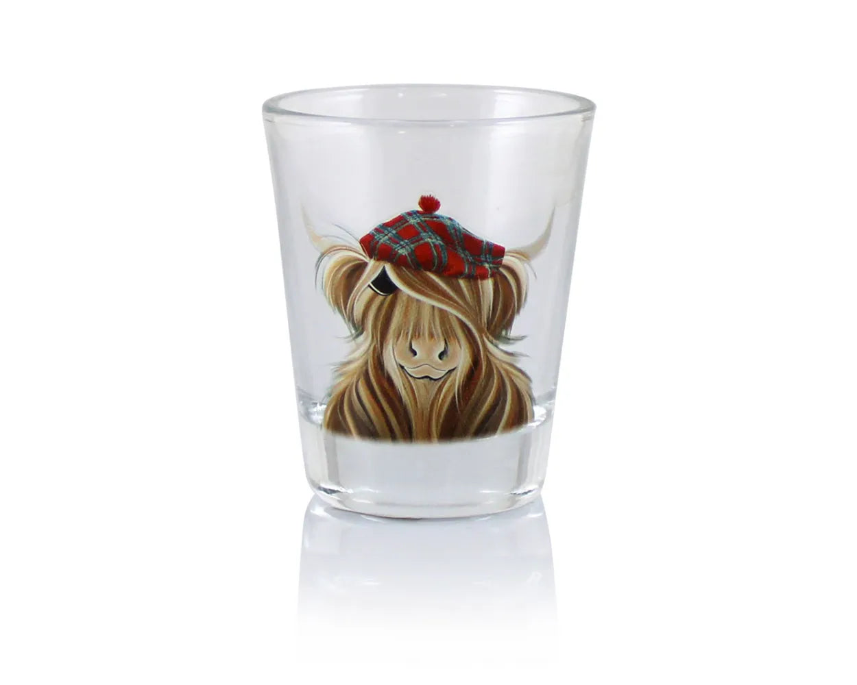 McMoo highland cow (or hielan' coo) shot glass designed by artist Jennifer Hogwood.