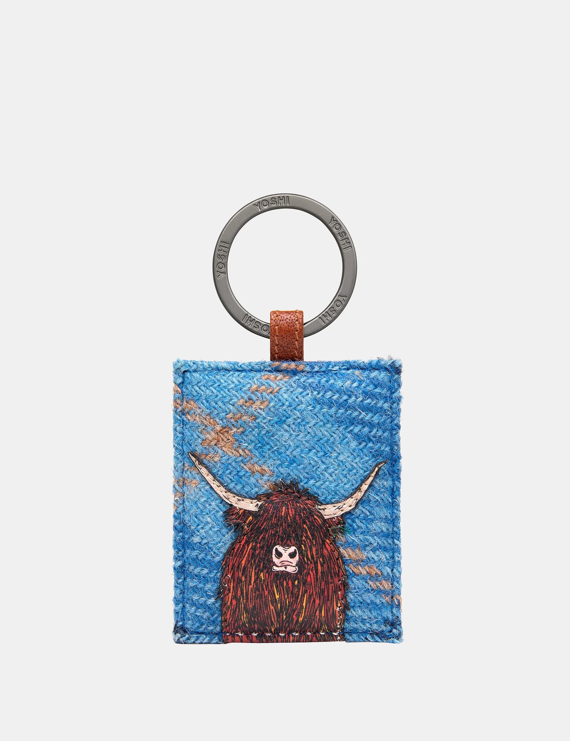 Highland Cow Brown Leather & Blue Harris Tweed Keyring