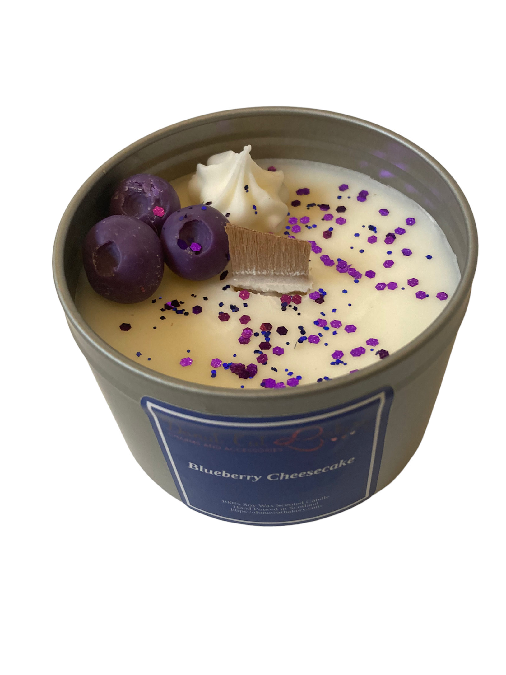 240ml soy wax scented candle in a silver tin with a clear lid to show-off all the gorgeous wax embellishments. Bursting with rich, ripe blueberries mixed into a thick and creamy cheesecake, creating a delectable fragrance and the ultimate classic dessert in a candle!