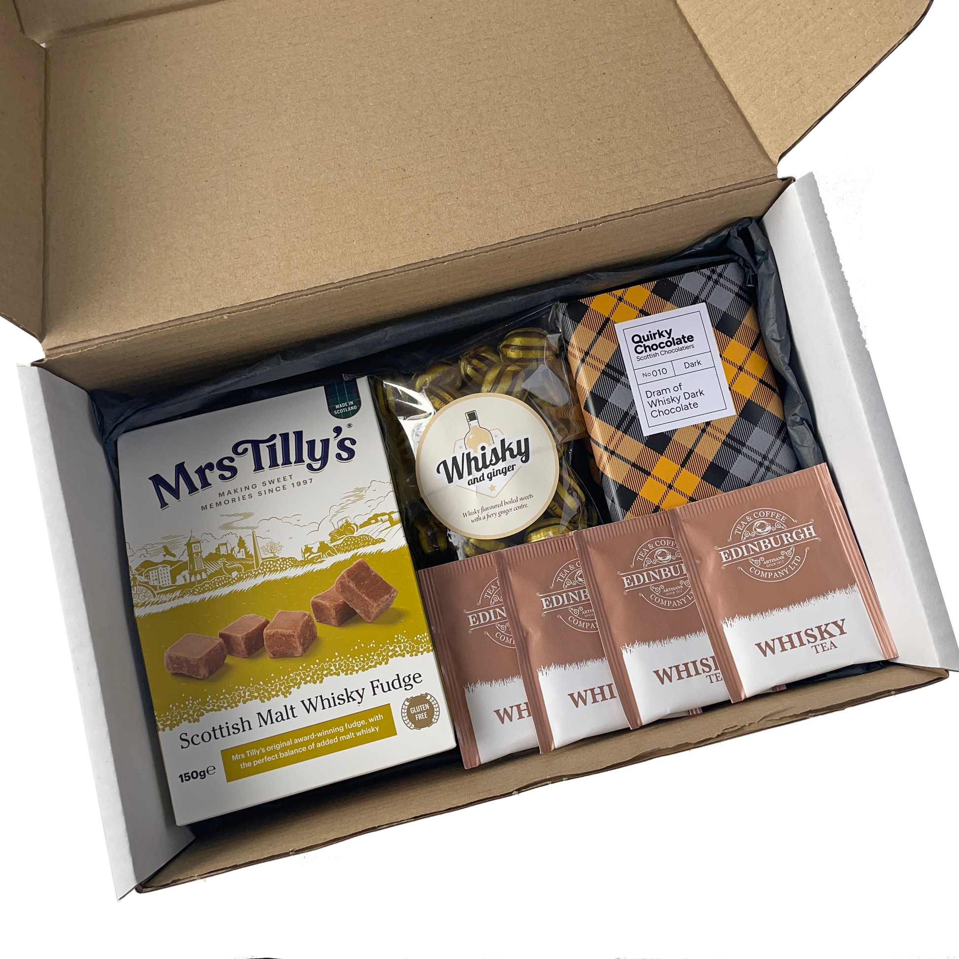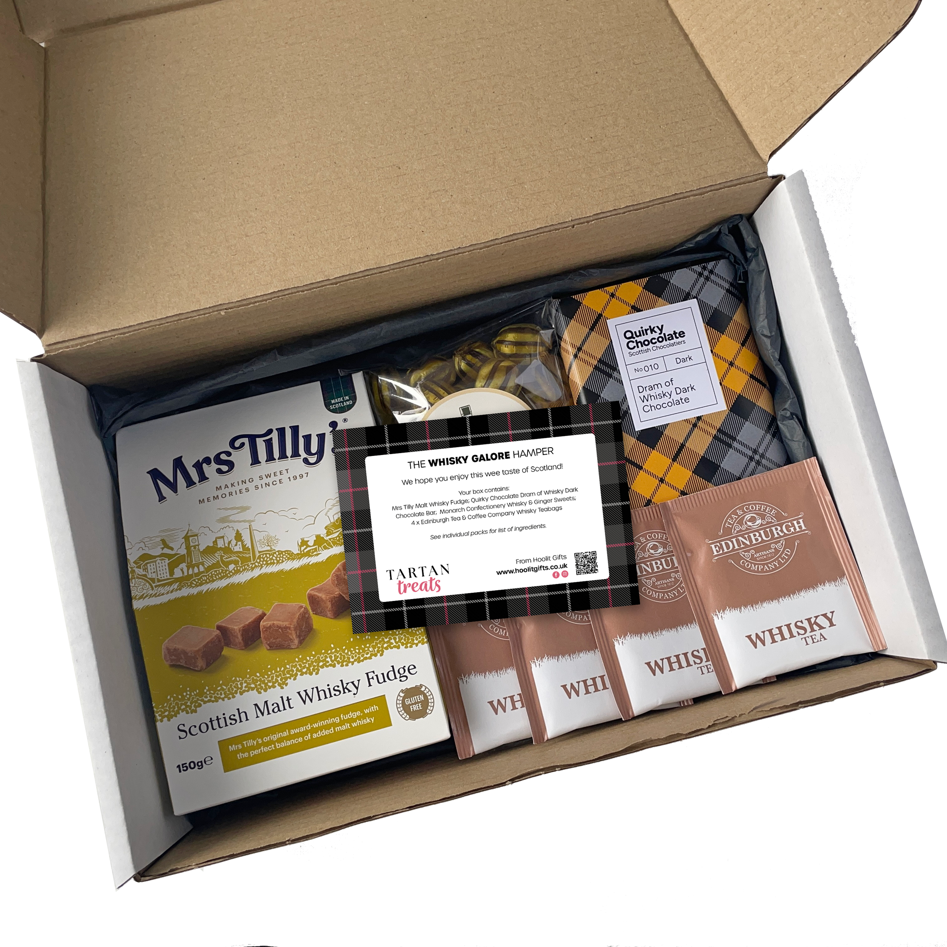 The 'Whisky Galore' hamper contains: 1 x Mrs Tilly's Malt Whisky Fudge (150g box); 1 x Quirky Chocolate Dram of Whisky Dark Chocolate Bar; 1 x Ross's Whisky & Ginger Sweets Bag; 4 x Edinburgh Tea & Coffee Company Whisky Teas.
