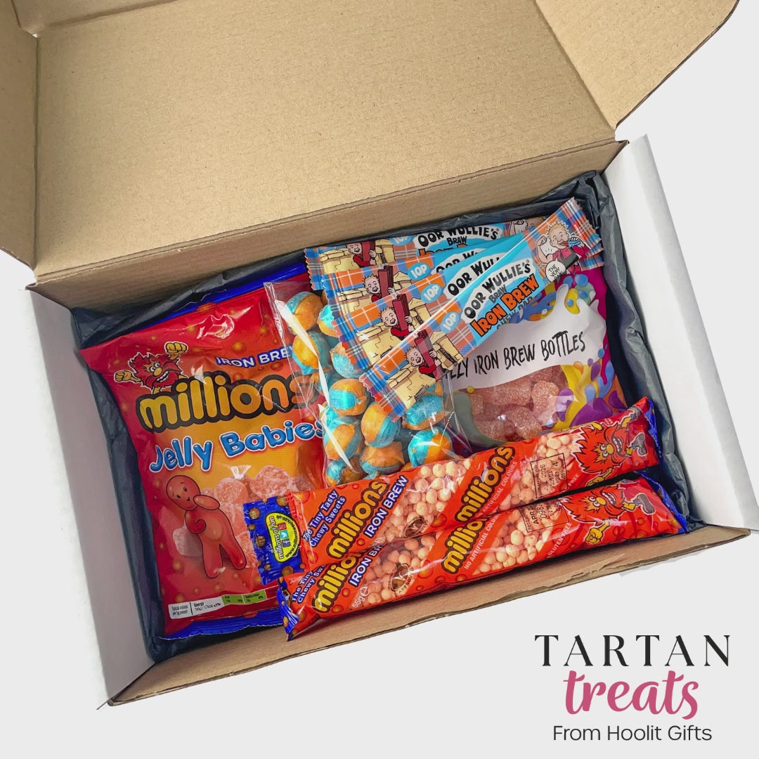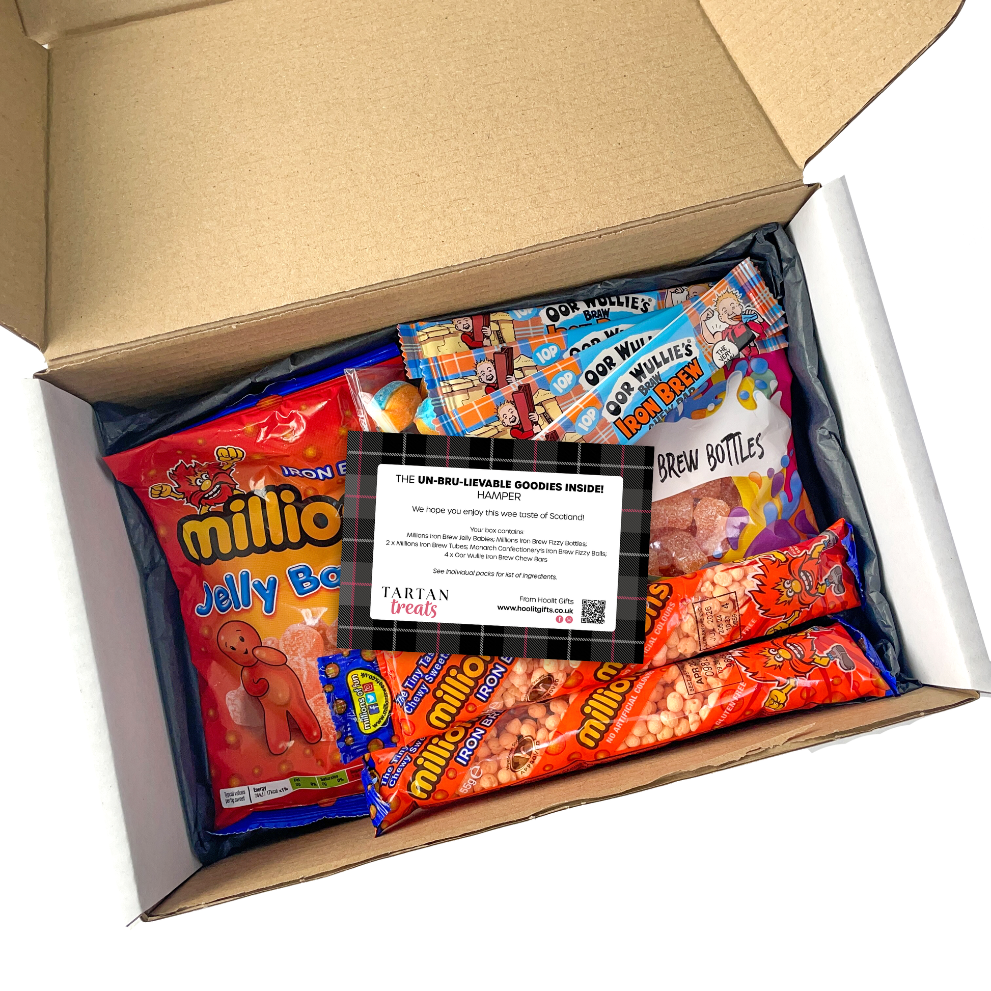 The 'Un-bru-lievable Goodies Inside!' hamper contains: Millions Iron Brew Jelly Babies; Buchanan's Iron Brew Fizzy Bottles; 2 x Millions Iron Brew Tubes; 4 x Oor Wullie Iron Brew Chew Bars; Monarch's Iron Brew Fizzy Balls.